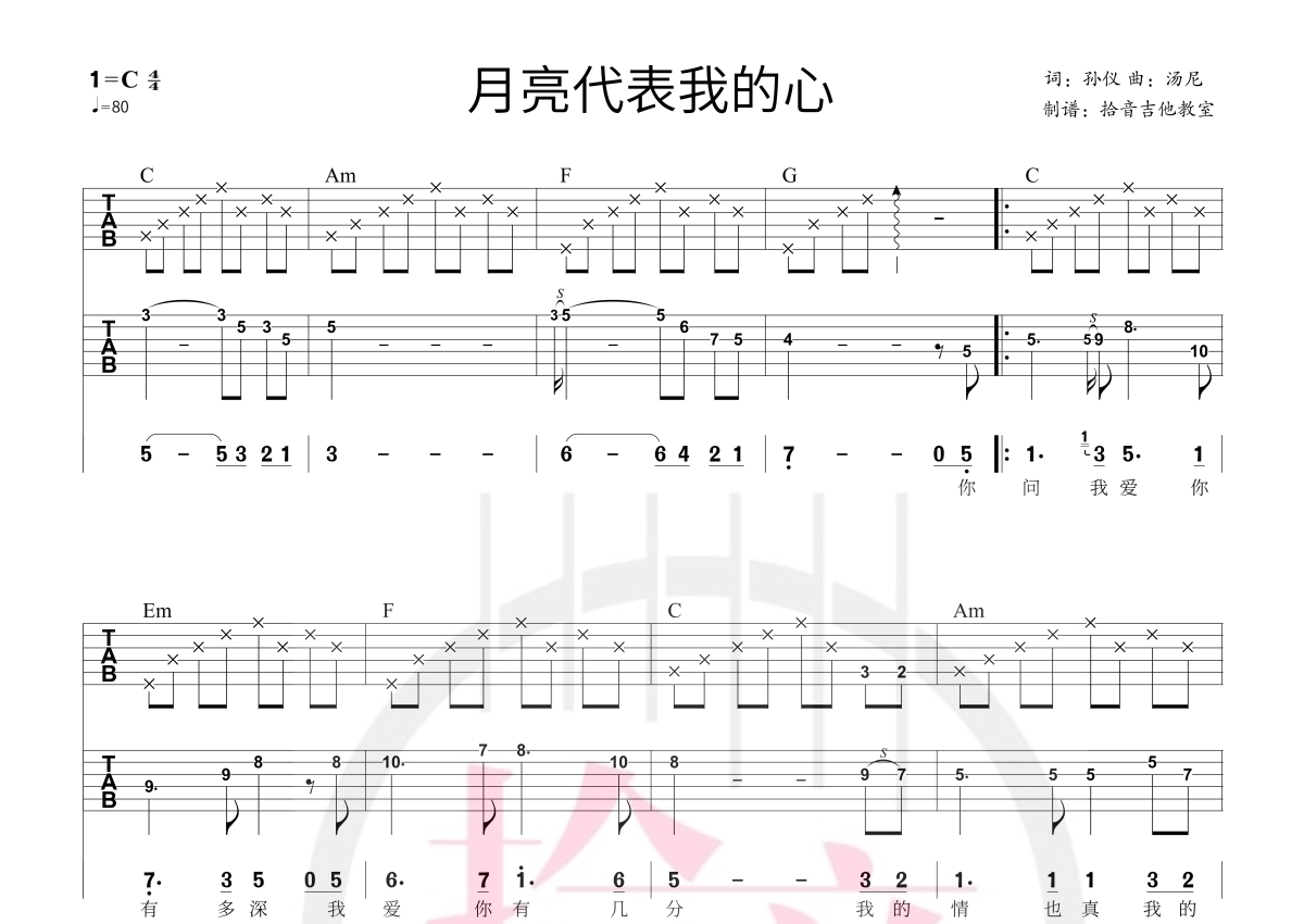 邓丽君《月亮代表我的心》吉他谱 - C调弹唱六线谱