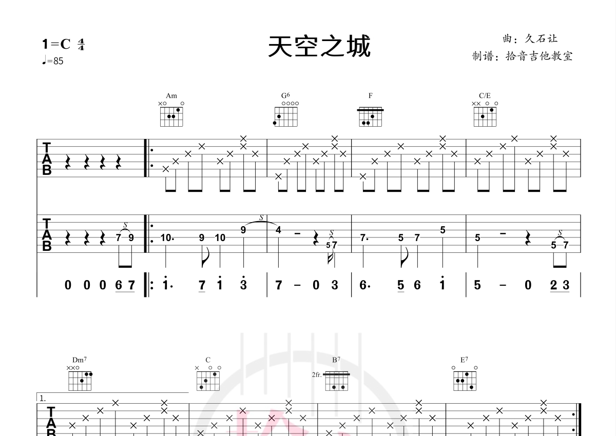 《天空之城》是久石让演唱的一首歌曲,拍号为4/4拍,歌曲速度为每分钟85拍,本吉他谱采用的是C调指法编配,这份吉他谱共有两张高清图谱,图谱由 @拾音吉他 编配上传,图谱使用六线谱编配,使用这份天空之城吉他谱,可以让你更加方便地掌握这首歌曲的演奏技巧,快来尝试吧。