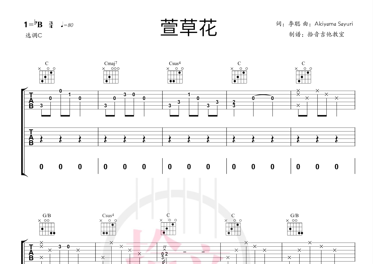 《萱草花》是张小斐演唱的一首歌曲,弹唱+solo,拍号为3/4拍,歌曲速度为每分钟83拍,歌曲原调为Bb调,但由于原调指法比较难,为了方便弹奏,本吉他谱采用的是C调指法编配,这份吉他谱共有四张高清图谱,图谱由 @拾音吉他 编配上传,图谱使用六线谱编配,使用这份萱草花吉他谱,可以让你更加方便地掌握这首歌曲的演奏技巧,快来尝试吧。