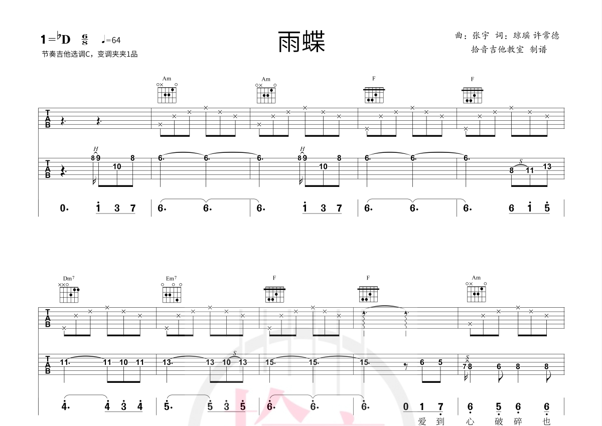 《雨蝶》是李翊君演唱的一首歌曲,弹唱+solo,拍号为6/8拍,歌曲速度为每分钟95拍,歌曲原调为Db调,但由于原调指法比较难,为了方便弹奏,本吉他谱采用的是C调指法编配,变调夹1品弹奏即为原调,当然也可以根据自己的音域改变变调夹位置,或者通过改变和弦调性,以方便自己弹奏,这份吉他谱共有两张高清图谱,图谱由 @拾音吉他 编配上传,图谱使用六线谱编配,使用这份雨蝶吉他谱,可以让你更加方便地掌握这首歌曲的演奏技巧,快来尝试吧。