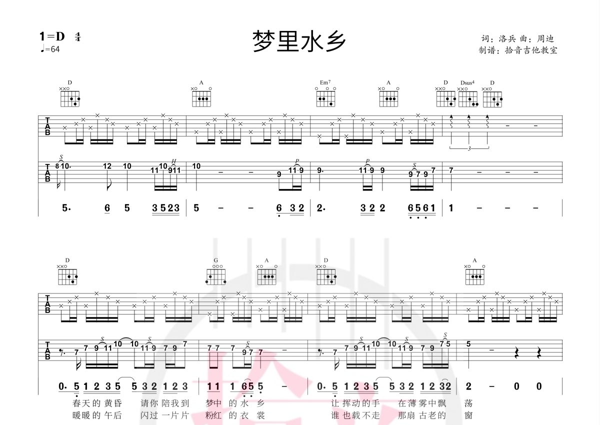 《梦里水乡》是江珊演唱的一首歌曲,拍号为4/4拍,歌曲速度为每分钟64拍,歌曲原调为D调,但由于原调指法比较难,为了方便弹奏,本吉他谱采用的是D调指法编配,演奏时不需要使用变调夹即为原调,这份吉他谱共有两张高清图谱,图谱由 @拾音吉他 编配上传,图谱使用六线谱编配,使用这份梦里水乡吉他谱,可以让你更加方便地掌握这首歌曲的演奏技巧,快来尝试吧。
