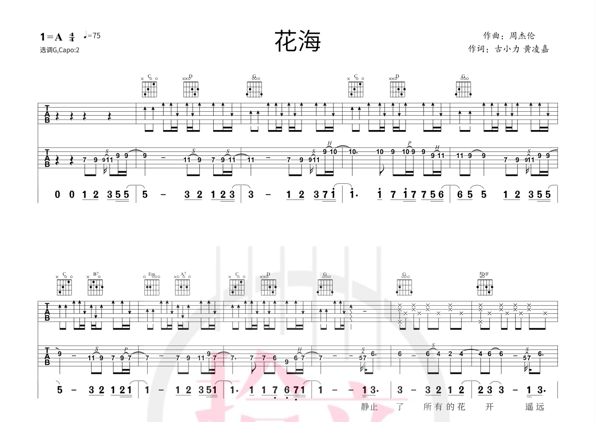 《花海》是周杰伦演唱的一首歌曲,拍号为4/4拍,歌曲速度为每分钟75拍,歌曲原调为A调,但由于原调指法比较难,为了方便弹奏,本吉他谱采用的是G调指法编配,变调夹2品弹奏即为原调,当然也可以根据自己的音域改变变调夹位置,或者通过改变和弦调性,以方便自己弹奏,这份吉他谱共有两张高清图谱,图谱由 @拾音吉他 编配上传,图谱使用六线谱编配,使用这份花海吉他谱,可以让你更加方便地掌握这首歌曲的演奏技巧,快来尝试吧。
