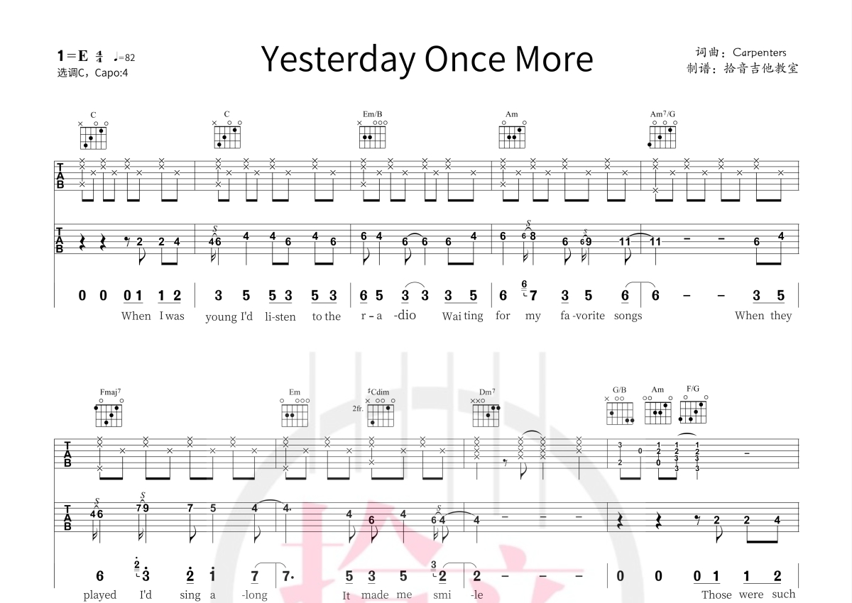 《Yesterday Once More》是Carpenters演唱的一首歌曲,拍号为4/4拍,歌曲速度为每分钟82拍,歌曲原调为E调,但由于原调指法比较难,为了方便弹奏,本吉他谱采用的是C调指法编配,变调夹4品弹奏即为原调,当然也可以根据自己的音域改变变调夹位置,或者通过改变和弦调性,以方便自己弹奏,这份吉他谱共有两张高清图谱,图谱由 @拾音吉他 编配上传,图谱使用六线谱编配,使用这份Yesterday Once More吉他谱,可以让你更加方便地掌握这首歌曲的演奏技巧,快来尝试吧。