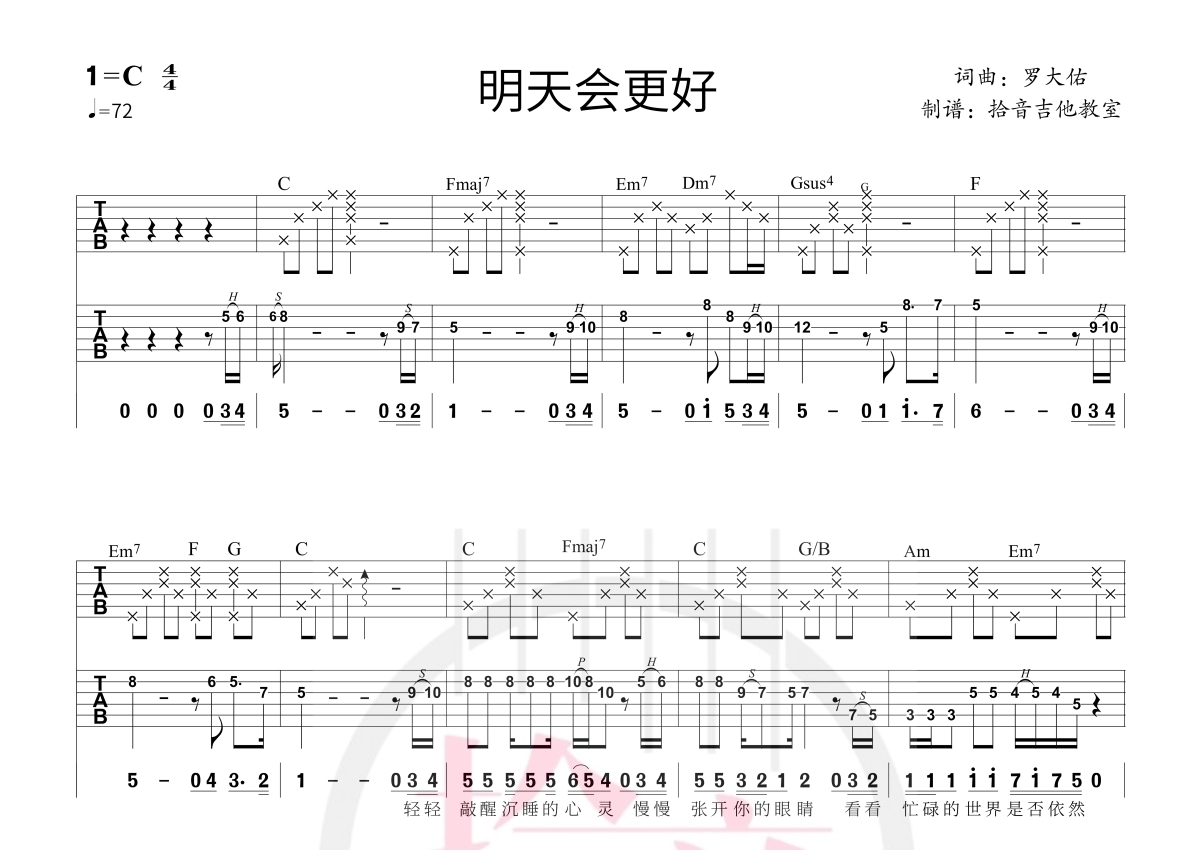 《明天会更好》是群星演唱的一首歌曲,solo+弹唱,拍号为4/4拍,歌曲速度为每分钟72拍,歌曲原调为C调,本吉他谱采用的是C调指法编配,演奏时不需要使用变调夹即为原调,这份吉他谱共有两张高清图谱,图谱由 @拾音吉他 编配上传,图谱使用六线谱编配,曲谱配备了相关的视频提供浏览,使用这份明天会更好吉他谱,可以让你更加方便地掌握这首歌曲的演奏技巧,快来尝试吧。弹唱和SOLO双吉他编配,个人或者双人弹唱和SOLO配合都可以,也有个人SOLO伴奏下载。