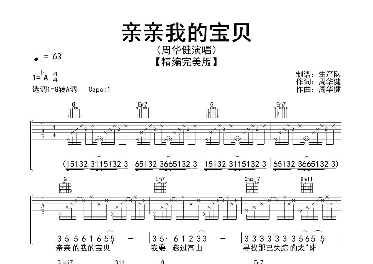 《亲亲我的宝贝》是周华健演唱的一首歌曲,精编完美版,拍号为4/4拍,歌曲速度为每分钟63拍,歌曲原调为Ab调,但由于原调指法比较难,为了方便弹奏,本吉他谱采用的是G调指法编配,变调夹1品弹奏即为原调,当然也可以根据自己的音域改变变调夹位置,或者通过改变和弦调性,以方便自己弹奏,这份吉他谱共有三张高清图谱,图谱由 @生产队 编配上传,图谱使用六线谱编配,包含吉他和弦指法、简谱以及歌词部分,使用这份亲亲我的宝贝吉他谱,可以让你更加方便地掌握这首歌曲的弹唱技巧,快来尝试吧。《亲亲我的宝贝》是周华健演唱的一首歌曲,由周华健作词、作曲,鲍比达编曲,收录在周华健1990年12月19日发行的专辑《不愿一个人》中 。本吉他谱根据原版采用G调转A调指法编配,精准的前奏,间奏,尾奏及SOLO编配,精编完美版本,怀旧经典!。