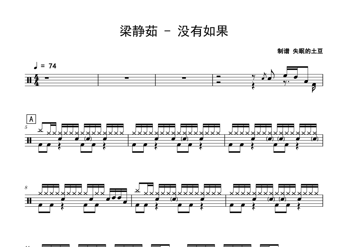 《没有如果》是梁静茹演唱的一首歌曲,拍号为4/4拍,歌曲速度为每分钟74拍,这份鼓谱共有四张高清图谱,图谱由 @老虎不说谎 编配上传,图谱使用五线谱编配,使用这份没有如果架子鼓谱,你将能够轻松地敲打出这首梁静茹的没有如果,快来尝试吧。