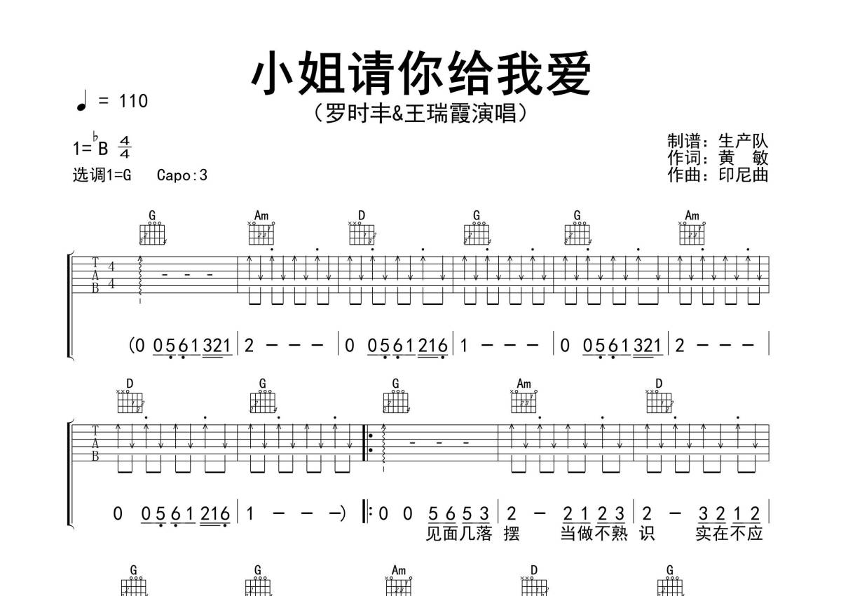 《小姐请你给我爱》是罗时丰、王瑞霞演唱的一首歌曲,精编扫弦版,拍号为4/4拍,歌曲速度为每分钟110拍,歌曲原调为Bb调,但由于原调指法比较难,为了方便弹奏,本吉他谱采用的是G调指法编配,变调夹3品弹奏即为原调,当然也可以根据自己的音域改变变调夹位置,或者通过改变和弦调性,以方便自己弹奏,这份吉他谱共有两张高清图谱,图谱由 @生产队 编配上传,图谱使用六线谱编配,包含吉他和弦指法、简谱以及歌词部分,使用这份小姐请你给我爱吉他谱,可以让你更加方便地掌握这首歌曲的弹唱技巧,快来尝试吧。《小姐请你给我爱》是由罗时丰、王瑞霞演唱的歌曲。本吉他谱根据原版采用G调指法编配,完整的前奏、间奏、尾奏和SOLO,扫弦切音节奏编配,效果很棒,怀旧经典!。