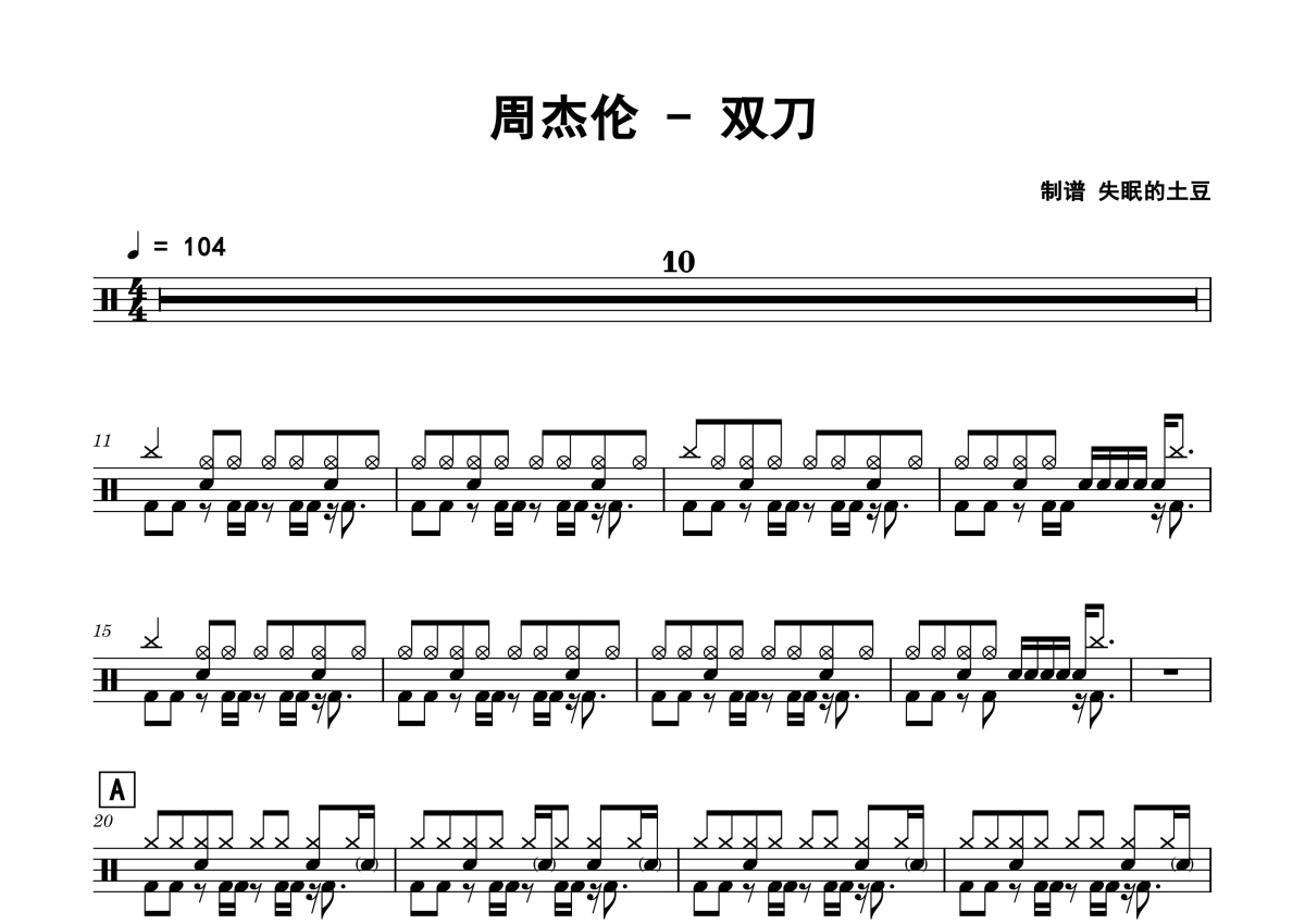 《双刀》是周杰伦演唱的一首歌曲,拍号为4/4拍,歌曲速度为每分钟104拍,这份鼓谱共有三张高清图谱,图谱由 @老虎不说谎 编配上传,图谱使用五线谱编配,使用这份双刀架子鼓谱,你将能够轻松地敲打出这首周杰伦的双刀,快来尝试吧。