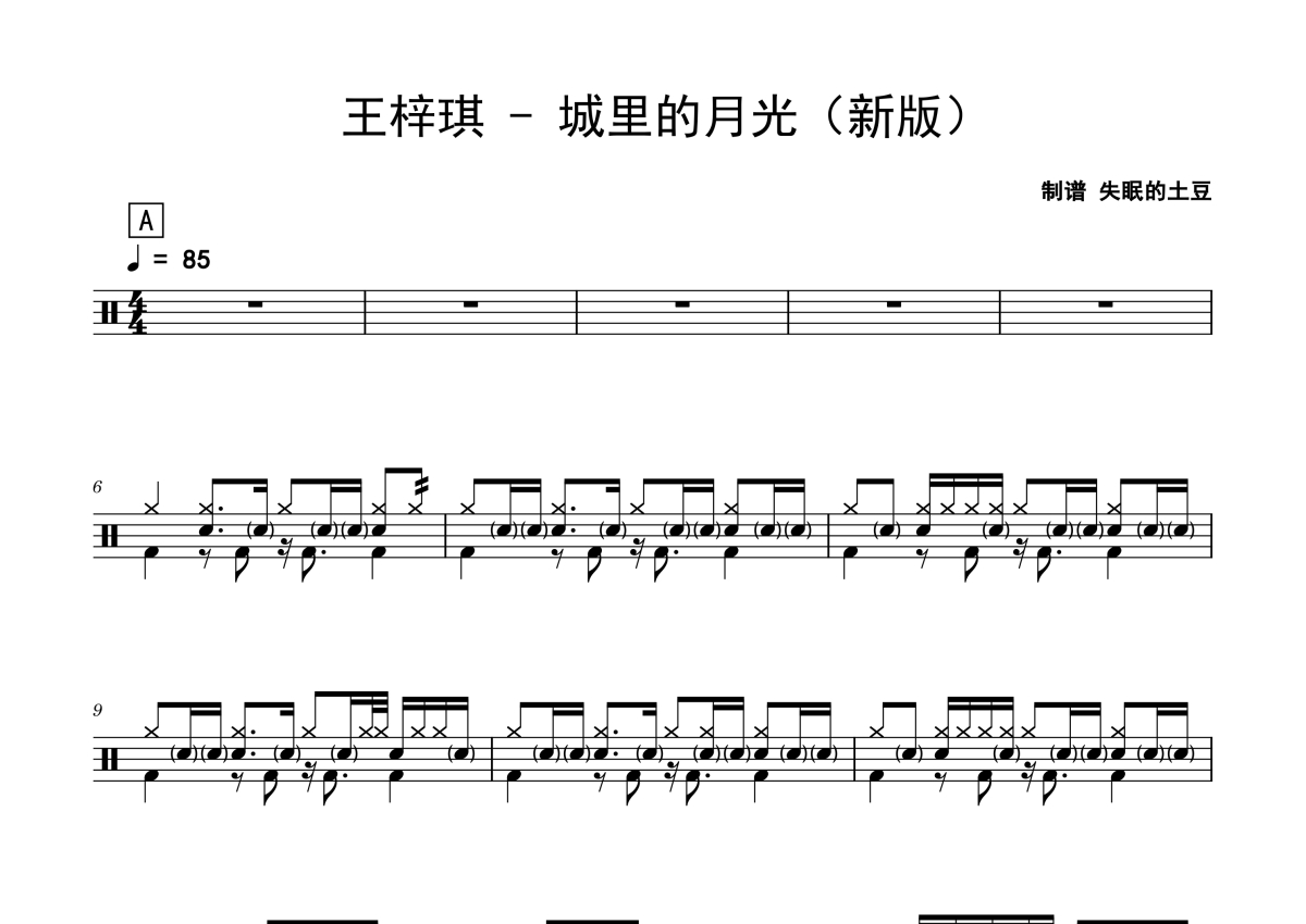 王梓琪《城里的月光》鼓谱 - 架子鼓谱 - 新版