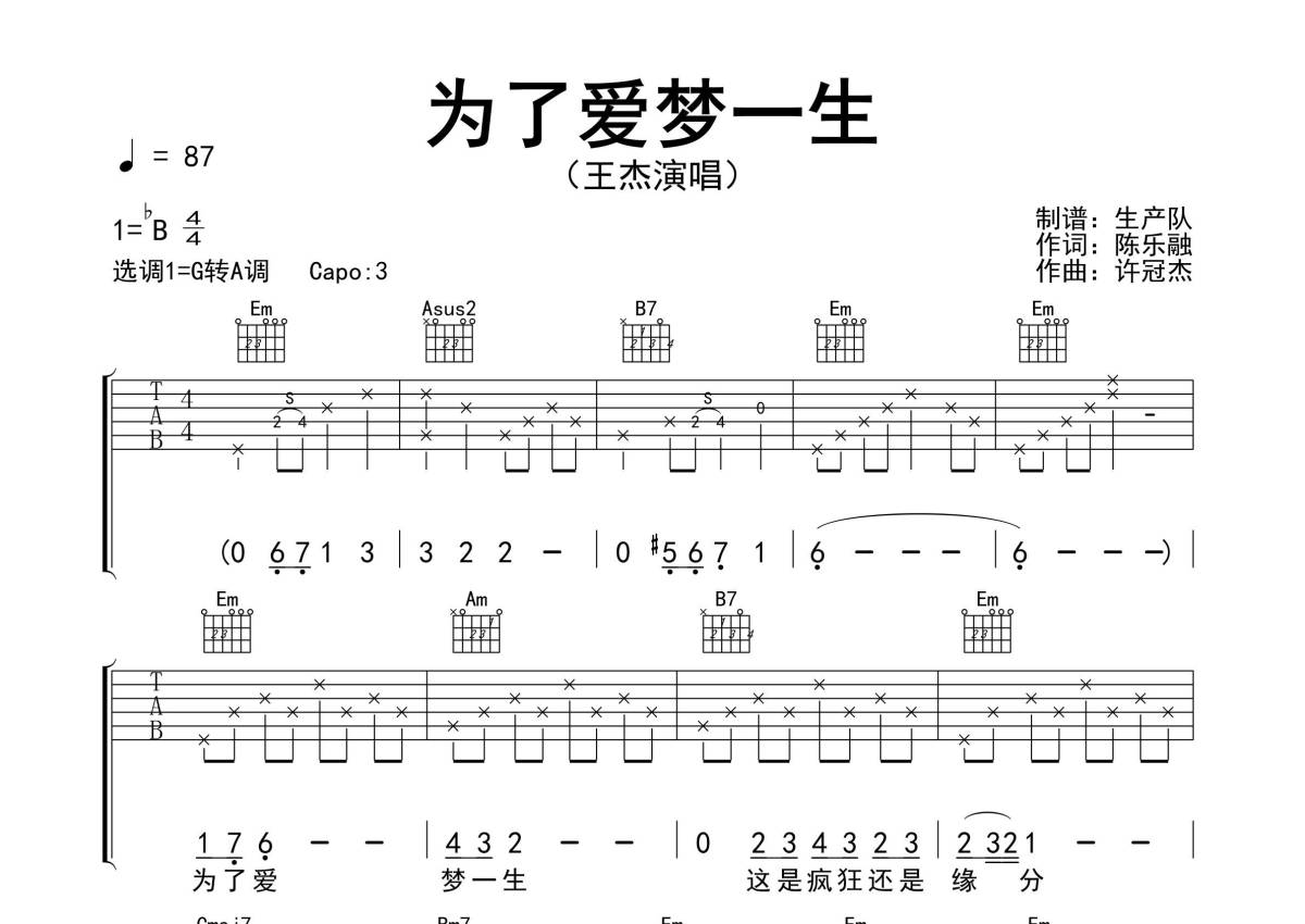 《为了爱梦一生》是王杰演唱的一首歌曲,精编完美版,拍号为4/4拍,歌曲速度为每分钟87拍,歌曲原调为Bb调,但由于原调指法比较难,为了方便弹奏,本吉他谱采用的是G调指法编配,变调夹3品弹奏即为原调,当然也可以根据自己的音域改变变调夹位置,或者通过改变和弦调性,以方便自己弹奏,这份吉他谱共有三张高清图谱,图谱由 @生产队 编配上传,图谱使用六线谱编配,包含吉他和弦指法、简谱以及歌词部分,使用这份为了爱梦一生吉他谱,可以让你更加方便地掌握这首歌曲的弹唱技巧,快来尝试吧。《为了爱梦一生》由陈乐融填词,许冠杰作曲,歌手王杰演唱的歌曲,也是王杰的经典名曲之一,此专辑也入围了隔年的金曲奖最佳演唱专辑奖。本吉他谱根据原版采用G调转A调指法编配,完整的前奏、间奏和SOLO编配,怀旧经典!。