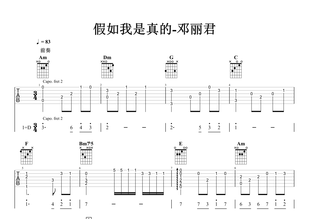 《假如我是真的》是邓丽君演唱的一首歌曲,石头音乐原版记谱,拍号为4/4拍,歌曲速度为每分钟79拍,歌曲原调为D调,但由于原调指法比较难,为了方便弹奏,本吉他谱采用的是C调指法编配,变调夹2品弹奏即为原调,当然也可以根据自己的音域改变变调夹位置,或者通过改变和弦调性,以方便自己弹奏,这份吉他谱共有三张高清图谱,图谱由 @石头音乐 编配上传,图谱使用六线谱编配,包含吉他和弦指法、简谱以及歌词部分,曲谱配备了相关的音频提供试听,使用这份假如我是真的吉他谱,可以让你更加方便地掌握这首歌曲的弹唱技巧,快来尝试吧。