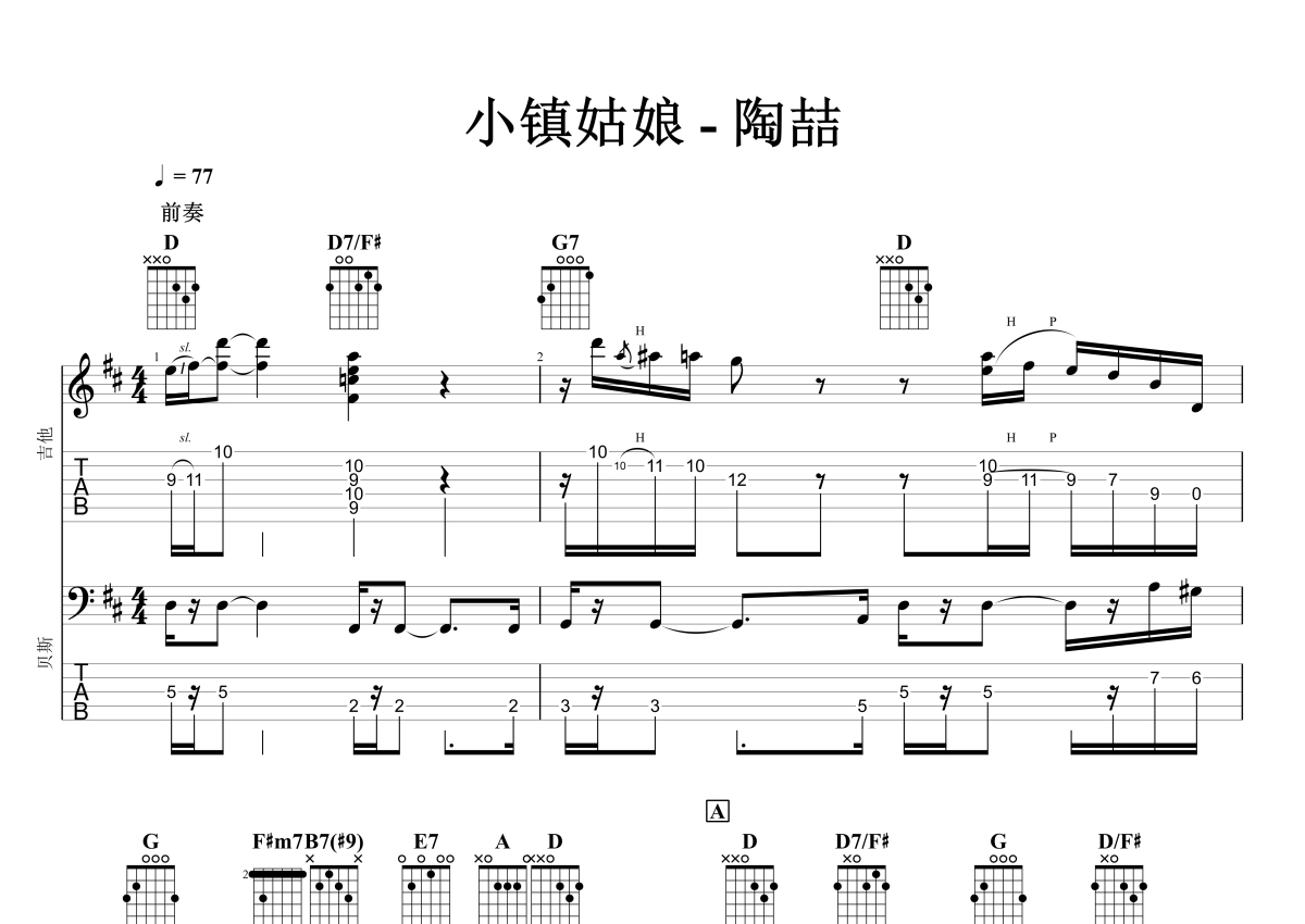 陶喆《小镇姑娘》吉他谱 - E调合奏谱 - 石头音乐原版记谱