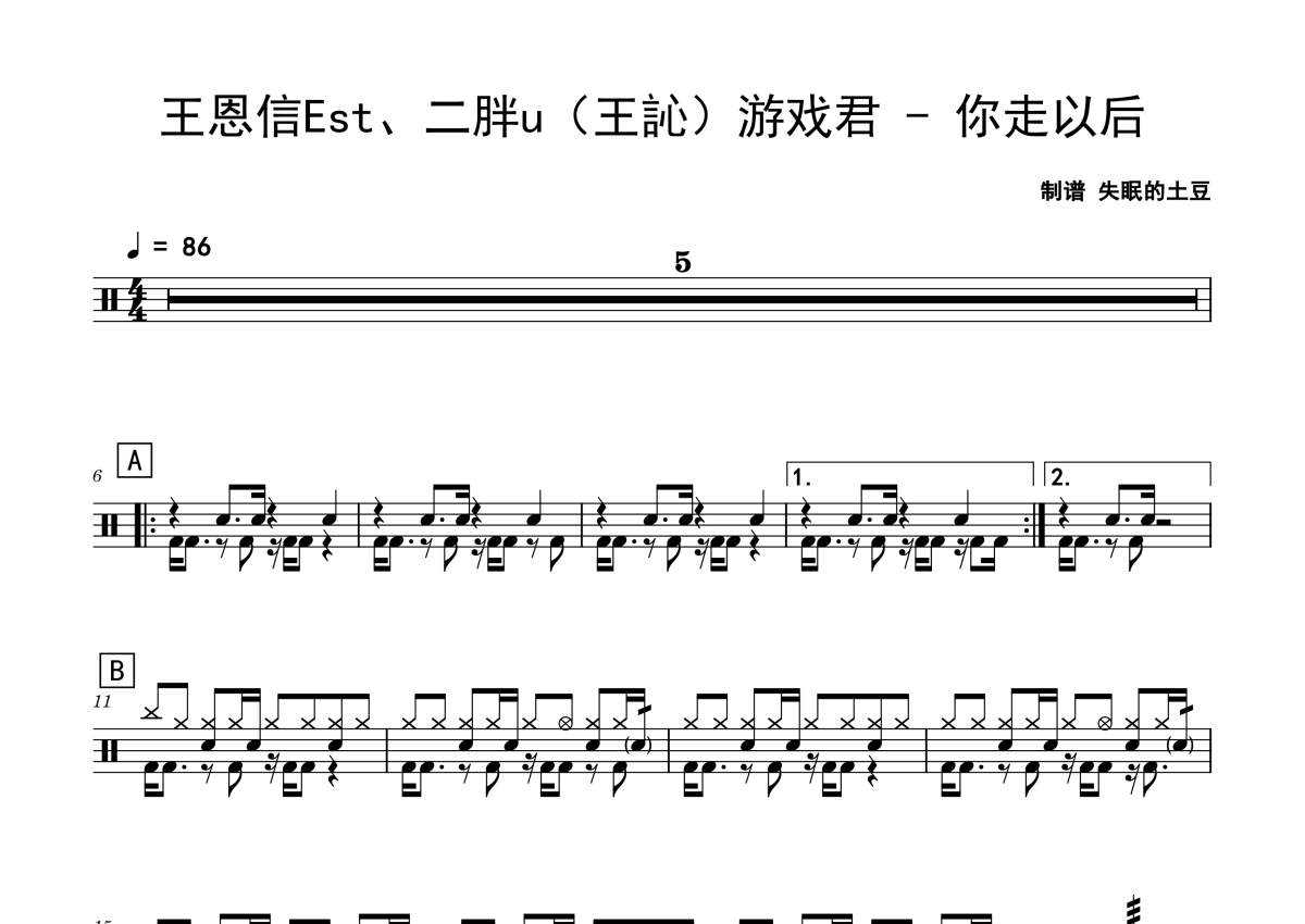 王恩信Est/二胖u《你走以后》鼓谱 - 架子鼓谱
