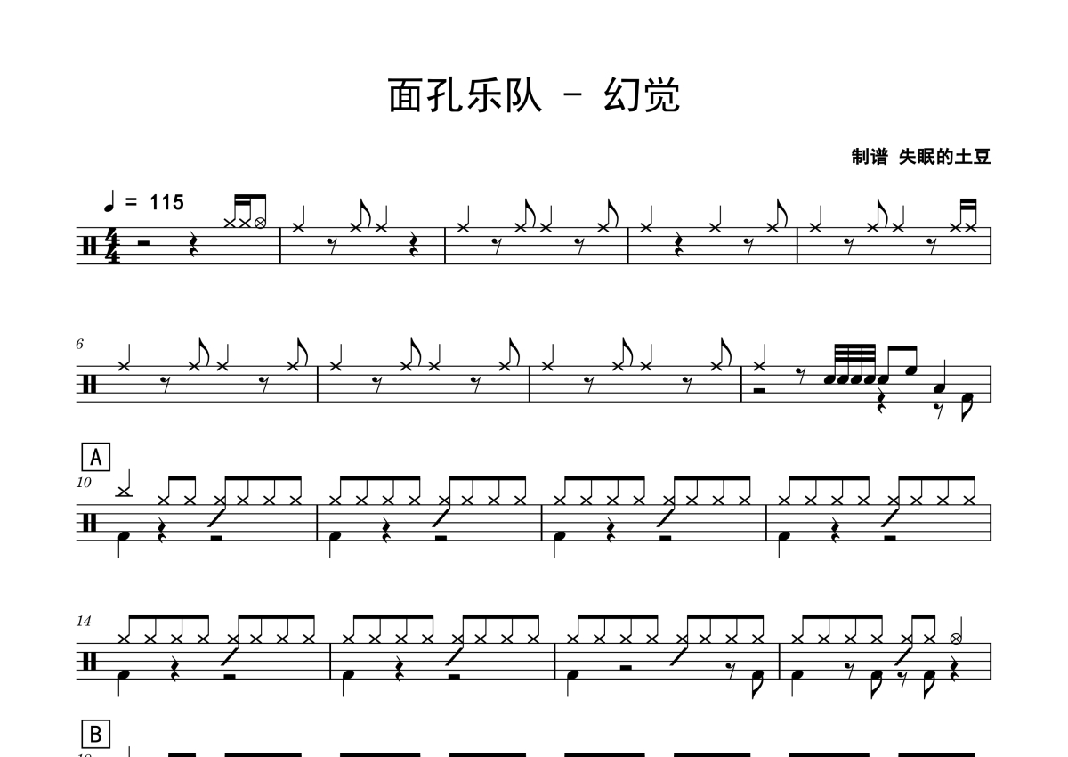 《幻觉》是面孔乐队演唱的一首歌曲,拍号为4/4拍,歌曲速度为每分钟115拍,这份鼓谱共有四张高清图谱,图谱由 @老虎不说谎 编配上传,图谱使用五线谱编配,使用这份幻觉架子鼓谱,你将能够轻松地敲打出这首面孔乐队的幻觉,快来尝试吧。