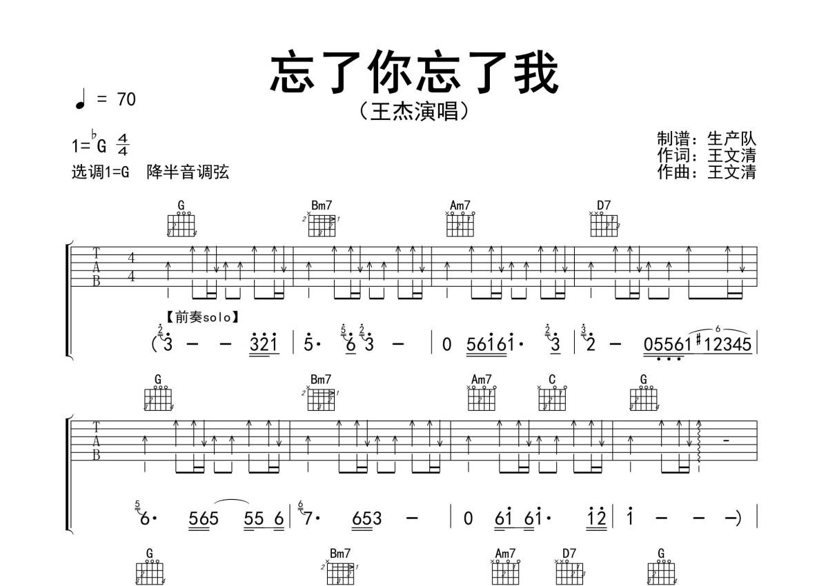 《忘了你忘了我》是王杰演唱的一首歌曲,精编完美版,拍号为4/4拍,歌曲速度为每分钟70拍,歌曲原调为Gb调,但由于原调指法比较难,为了方便弹奏,本吉他谱采用的是G调指法编配,降半音调弦弹奏即为原调,当然也可以根据自己的音域决定是否调弦,这份吉他谱共有三张高清图谱,图谱由 @生产队 编配上传,图谱使用六线谱编配,包含吉他和弦指法、简谱以及歌词部分,使用这份忘了你忘了我吉他谱,可以让你更加方便地掌握这首歌曲的弹唱技巧,快来尝试吧。《忘了你忘了我》是王杰演唱的经典歌曲,也是王家卫处女作《旺角卡门》电影插曲。本吉他谱根据原版采用G调指法编配,精准的前奏、间奏和SOLO编配,怀旧经典!。