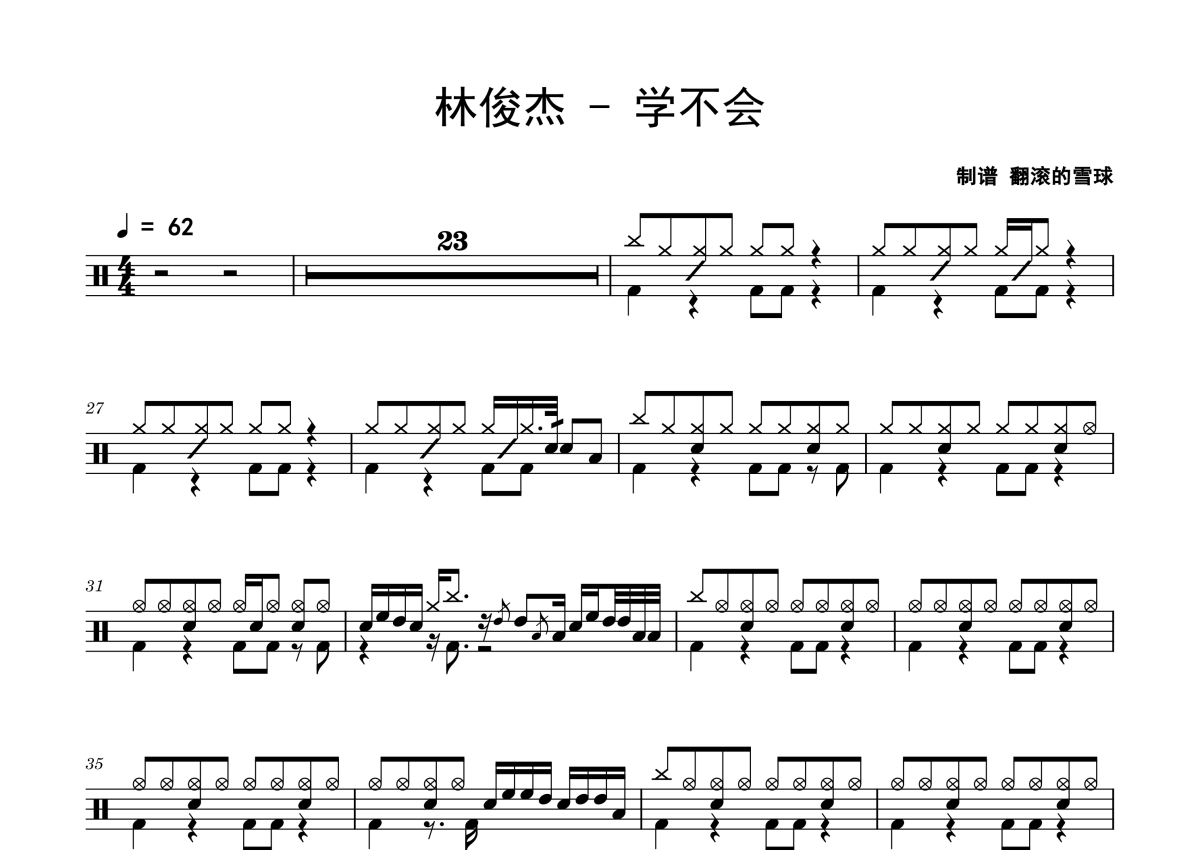 《学不会》是林俊杰演唱的一首歌曲,拍号为4/4拍,歌曲速度为每分钟62拍,这份鼓谱共有一张高清图谱,图谱由 @老虎不说谎 编配上传,图谱使用五线谱编配,使用这份学不会架子鼓谱,你将能够轻松地敲打出这首林俊杰的学不会,快来尝试吧。