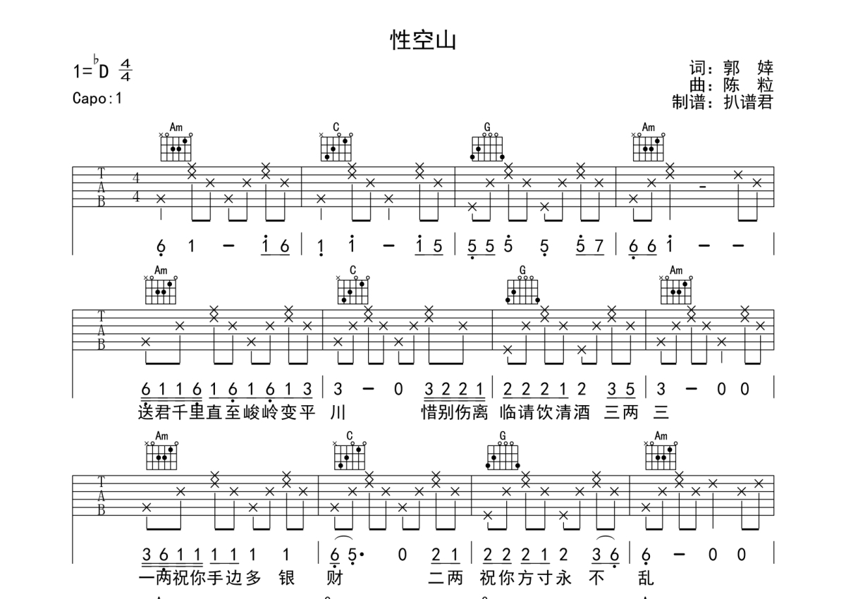 《性空山》是陈粒演唱的一首歌曲,拍号为4/4拍,歌曲原调为Db调,但由于原调指法比较难,为了方便弹奏,本吉他谱采用的是C调指法编配,变调夹1品弹奏即为原调,当然也可以根据自己的音域改变变调夹位置,或者通过改变和弦调性,以方便自己弹奏,这份吉他谱共有两张高清图谱,图谱由 @扒谱君 编配上传,图谱使用六线谱编配,包含吉他和弦指法、简谱以及歌词部分,使用这份性空山吉他谱,可以让你更加方便地掌握这首歌曲的弹唱技巧,快来尝试吧。
