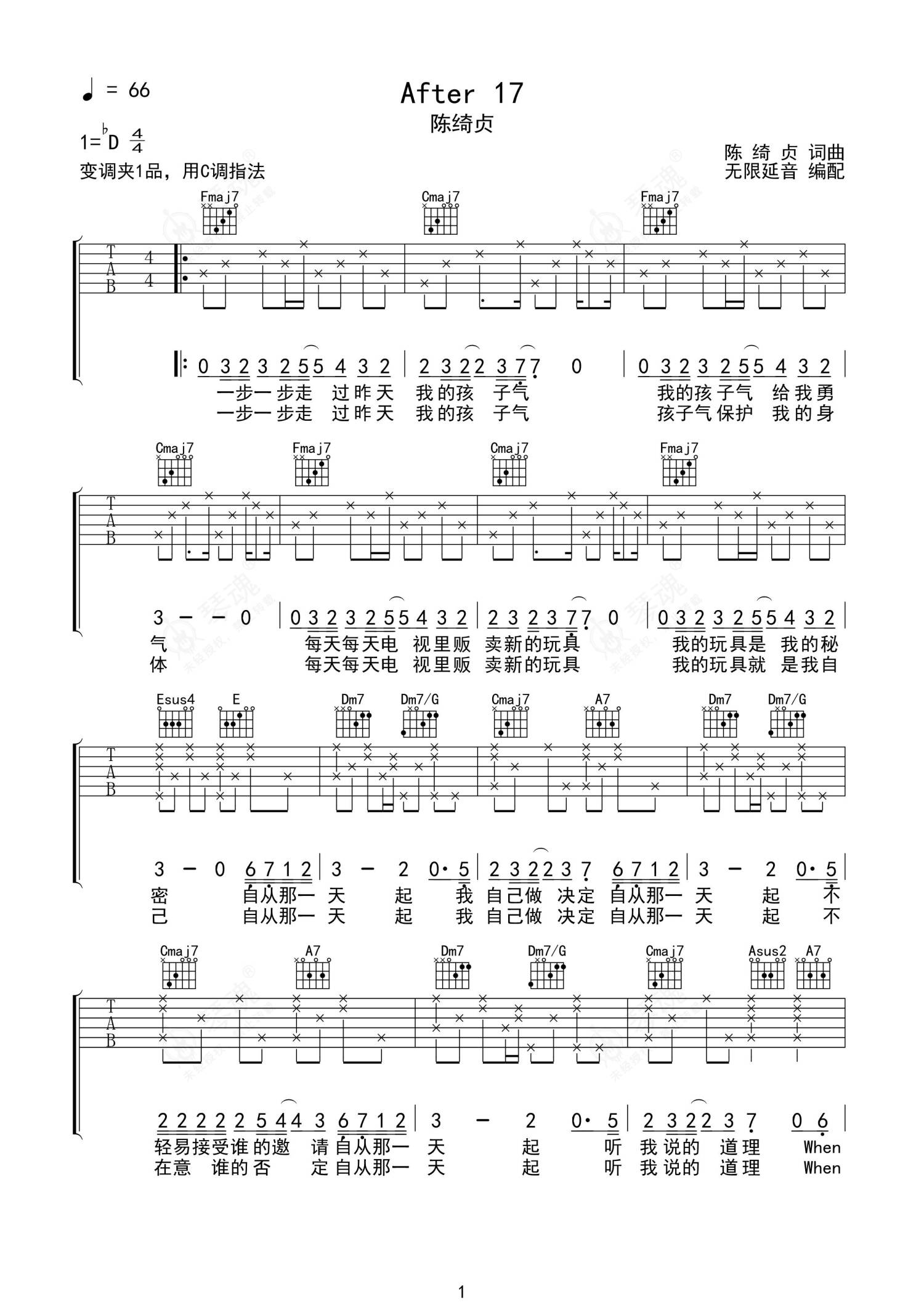 《After 17》是陈绮贞演唱的一首歌曲,拍号为4/4拍,歌曲速度为每分钟66拍,歌曲原调为Db调,但由于原调指法比较难,为了方便弹奏,本吉他谱采用的是C调指法编配,变调夹1品弹奏即为原调,当然也可以根据自己的音域改变变调夹位置,或者通过改变和弦调性,以方便自己弹奏,这份吉他谱共有两张高清图谱,图谱由 @无限延音 编配上传,图谱使用六线谱编配,包含吉他和弦指法、简谱以及歌词部分,使用这份After 17吉他谱,可以让你更加方便地掌握这首歌曲的弹唱技巧,快来尝试吧。