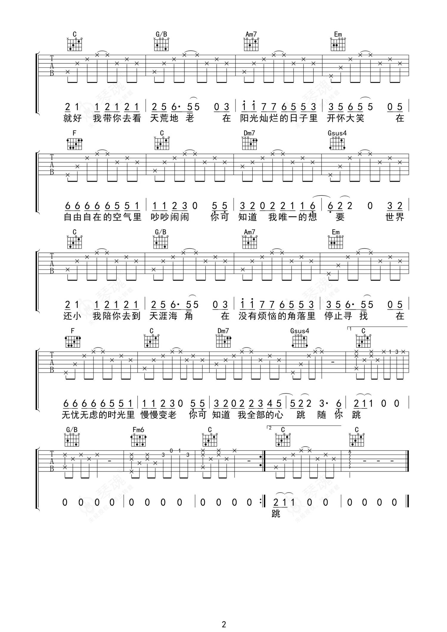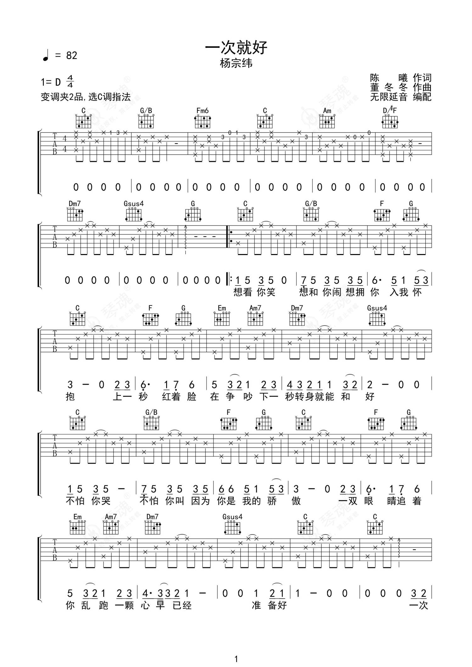 《一次就好》是杨宗纬演唱的一首歌曲,拍号为4/4拍,歌曲速度为每分钟82拍,歌曲原调为D调,但由于原调指法比较难,为了方便弹奏,本吉他谱采用的是C调指法编配,变调夹2品弹奏即为原调,当然也可以根据自己的音域改变变调夹位置,或者通过改变和弦调性,以方便自己弹奏,这份吉他谱共有两张高清图谱,图谱由 @无限延音 编配上传,图谱使用六线谱编配,包含吉他和弦指法、简谱以及歌词部分,使用这份一次就好吉他谱,可以让你更加方便地掌握这首歌曲的弹唱技巧,快来尝试吧。