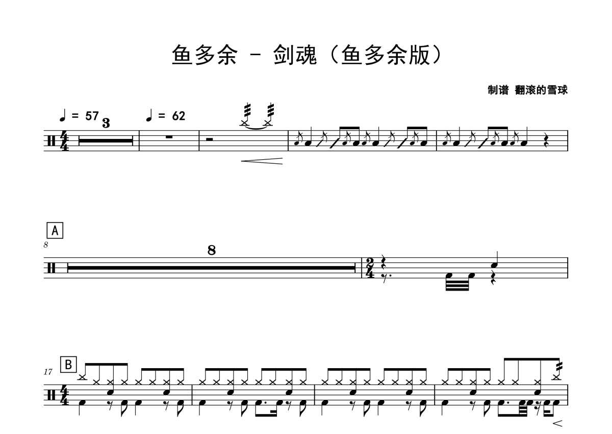 《剑魂》是鱼多余演唱的一首歌曲,鱼多余版,拍号为4/4拍,歌曲速度为每分钟57拍,这份鼓谱共有两张高清图谱,图谱由 @老虎不说谎 编配上传,图谱使用五线谱编配,使用这份剑魂架子鼓谱,你将能够轻松地敲打出这首鱼多余的剑魂,快来尝试吧。