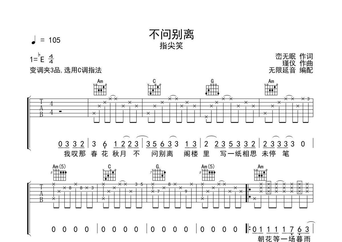 《不问别离》是指尖笑演唱的一首歌曲,拍号为4/4拍,歌曲速度为每分钟105拍,歌曲原调为Eb调,但由于原调指法比较难,为了方便弹奏,本吉他谱采用的是C调指法编配,变调夹3品弹奏即为原调,当然也可以根据自己的音域改变变调夹位置,或者通过改变和弦调性,以方便自己弹奏,这份吉他谱共有三张高清图谱,图谱由 @无限延音 编配上传,图谱使用六线谱编配,包含吉他和弦指法、简谱以及歌词部分,使用这份不问别离吉他谱,可以让你更加方便地掌握这首歌曲的弹唱技巧,快来尝试吧。