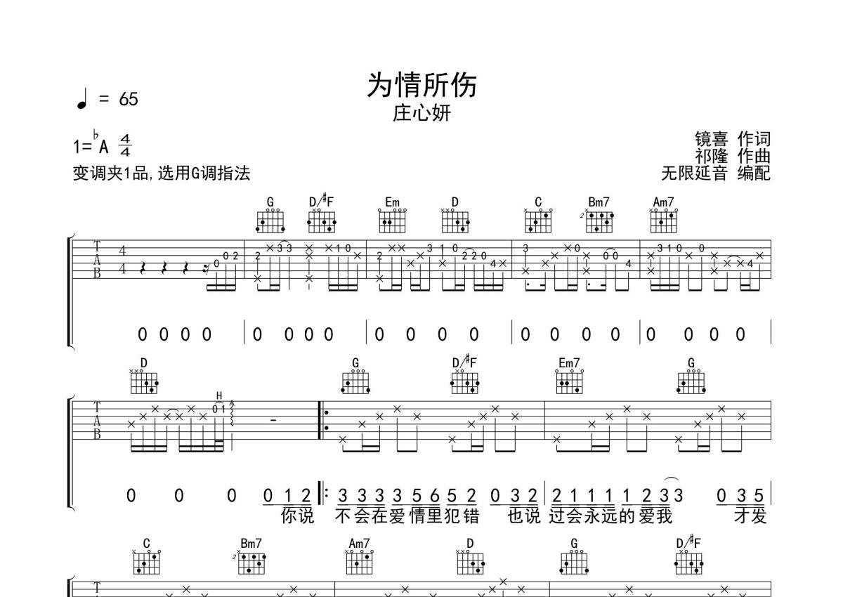 《为情所伤》是庄心妍演唱的一首歌曲,拍号为4/4拍,歌曲速度为每分钟65拍,歌曲原调为Ab调,但由于原调指法比较难,为了方便弹奏,本吉他谱采用的是G调指法编配,变调夹1品弹奏即为原调,当然也可以根据自己的音域改变变调夹位置,或者通过改变和弦调性,以方便自己弹奏,这份吉他谱共有两张高清图谱,图谱由 @无限延音 编配上传,图谱使用六线谱编配,包含吉他和弦指法、简谱以及歌词部分,使用这份为情所伤吉他谱,可以让你更加方便地掌握这首歌曲的弹唱技巧,快来尝试吧。