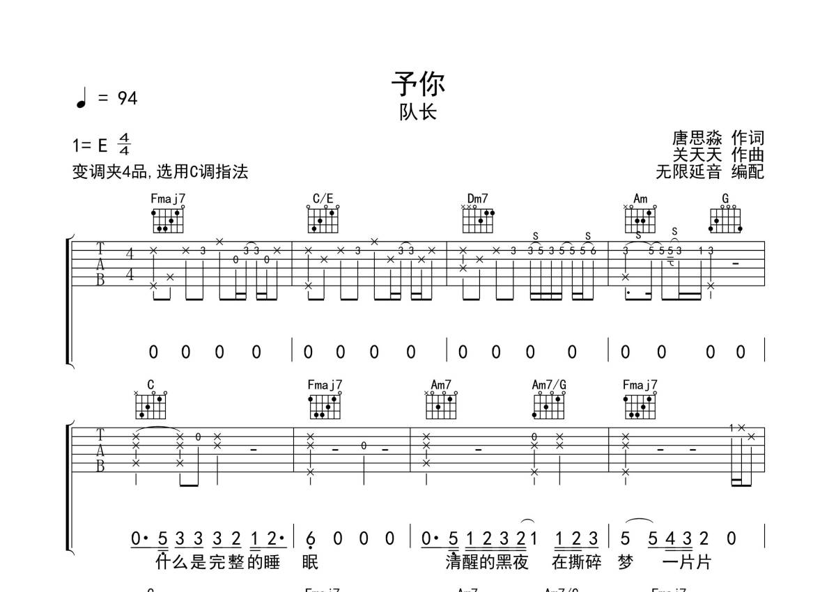 《予你》是队长演唱的一首歌曲,拍号为4/4拍,歌曲速度为每分钟94拍,歌曲原调为E调,但由于原调指法比较难,为了方便弹奏,本吉他谱采用的是C调指法编配,变调夹4品弹奏即为原调,当然也可以根据自己的音域改变变调夹位置,或者通过改变和弦调性,以方便自己弹奏,这份吉他谱共有四张高清图谱,图谱由 @无限延音 编配上传,图谱使用六线谱编配,包含吉他和弦指法、简谱以及歌词部分,使用这份予你吉他谱,可以让你更加方便地掌握这首歌曲的弹唱技巧,快来尝试吧。