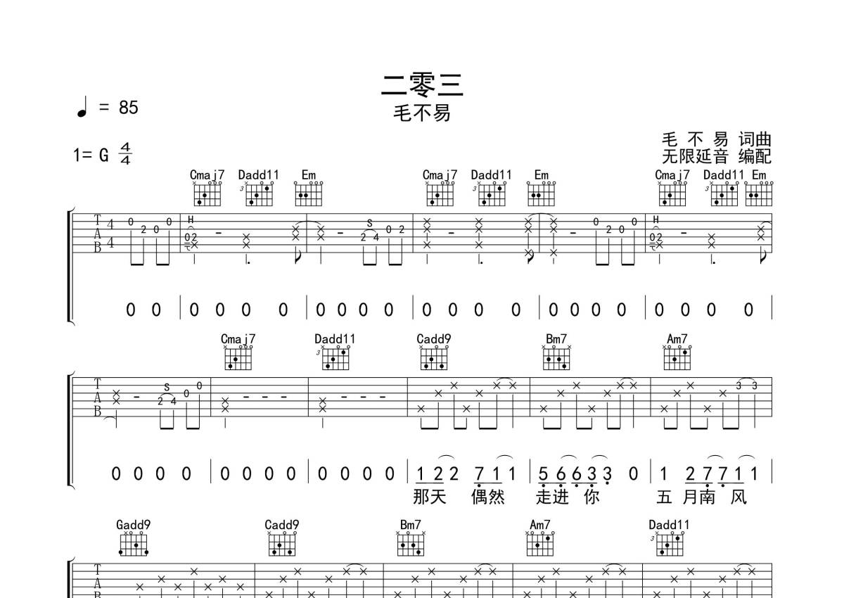 毛不易《二零三》吉他谱 - G调弹唱六线谱