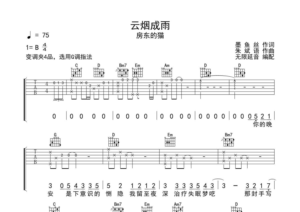 《云雨成烟》是房东的猫演唱的一首歌曲,拍号为4/4拍,歌曲速度为每分钟75拍,歌曲原调为B调,但由于原调指法比较难,为了方便弹奏,本吉他谱采用的是G调指法编配,变调夹4品弹奏即为原调,当然也可以根据自己的音域改变变调夹位置,或者通过改变和弦调性,以方便自己弹奏,这份吉他谱共有三张高清图谱,图谱由 @无限延音 编配上传,图谱使用六线谱编配,包含吉他和弦指法、简谱以及歌词部分,使用这份云雨成烟吉他谱,可以让你更加方便地掌握这首歌曲的弹唱技巧,快来尝试吧。