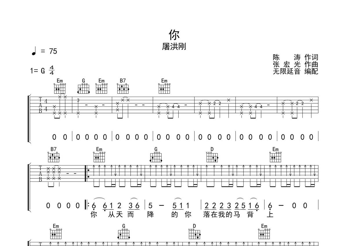 屠洪刚《你》吉他谱 - G调弹唱六线谱