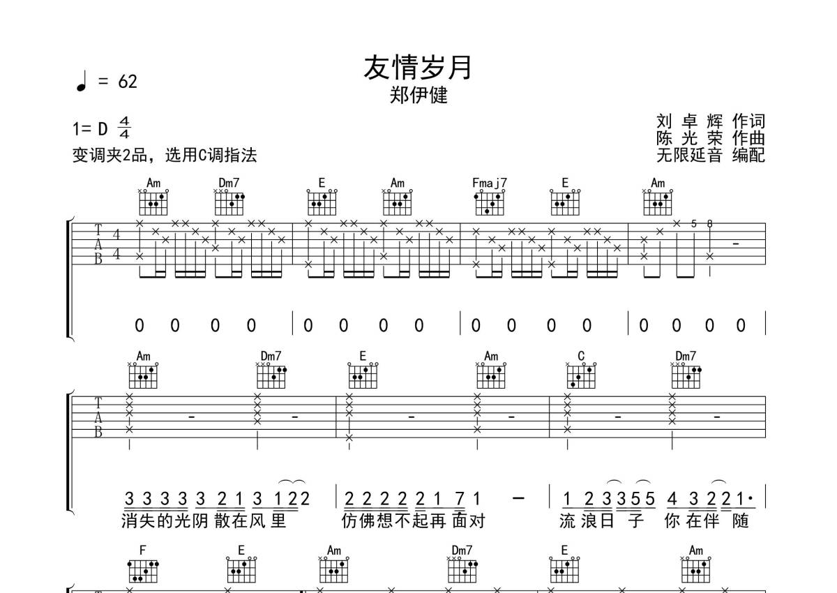 《友情岁月》是郑伊健演唱的一首歌曲,拍号为4/4拍,歌曲速度为每分钟62拍,歌曲原调为D调,但由于原调指法比较难,为了方便弹奏,本吉他谱采用的是C调指法编配,变调夹2品弹奏即为原调,当然也可以根据自己的音域改变变调夹位置,或者通过改变和弦调性,以方便自己弹奏,这份吉他谱共有两张高清图谱,图谱由 @无限延音 编配上传,图谱使用六线谱编配,包含吉他和弦指法、简谱以及歌词部分,使用这份友情岁月吉他谱,可以让你更加方便地掌握这首歌曲的弹唱技巧,快来尝试吧。