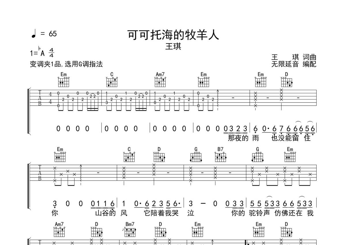 《可可托海的牧羊人》是王琪演唱的一首歌曲,拍号为4/4拍,歌曲速度为每分钟65拍,歌曲原调为Ab调,但由于原调指法比较难,为了方便弹奏,本吉他谱采用的是G调指法编配,变调夹1品弹奏即为原调,当然也可以根据自己的音域改变变调夹位置,或者通过改变和弦调性,以方便自己弹奏,这份吉他谱共有三张高清图谱,图谱由 @无限延音 编配上传,图谱使用六线谱编配,包含吉他和弦指法、简谱以及歌词部分,使用这份可可托海的牧羊人吉他谱,可以让你更加方便地掌握这首歌曲的弹唱技巧,快来尝试吧。