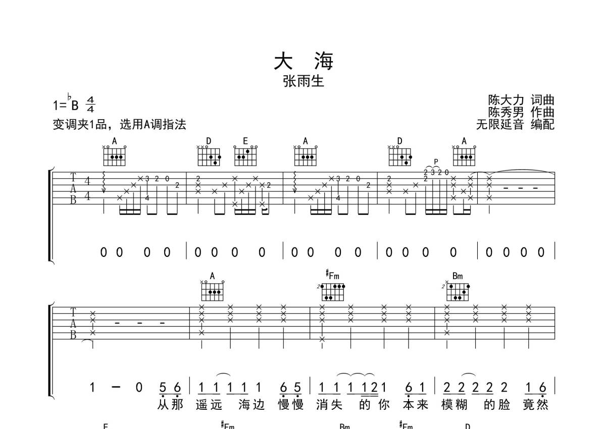 《大海》是张雨生演唱的一首歌曲,拍号为4/4拍,歌曲原调为Bb调,但由于原调指法比较难,为了方便弹奏,本吉他谱采用的是A调指法编配,变调夹1品弹奏即为原调,当然也可以根据自己的音域改变变调夹位置,或者通过改变和弦调性,以方便自己弹奏,这份吉他谱共有三张高清图谱,图谱由 @无限延音 编配上传,图谱使用六线谱编配,包含吉他和弦指法、简谱以及歌词部分,使用这份大海吉他谱,可以让你更加方便地掌握这首歌曲的弹唱技巧,快来尝试吧。