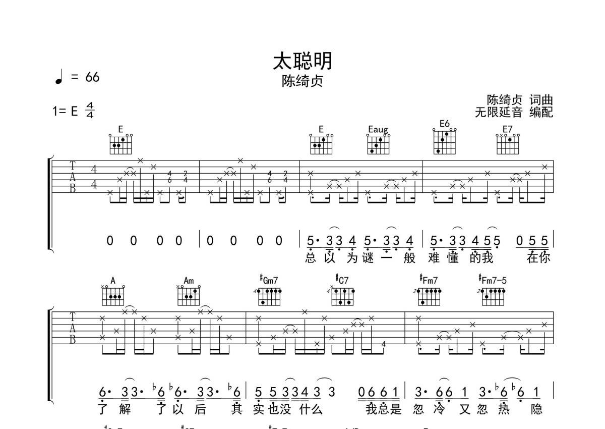 《太聪明》是陈绮贞演唱的一首歌曲,拍号为4/4拍,歌曲速度为每分钟66拍,本吉他谱采用的是E调指法编配,这份吉他谱共有四张高清图谱,图谱由 @无限延音 编配上传,图谱使用六线谱编配,包含吉他和弦指法、简谱以及歌词部分,使用这份太聪明吉他谱,可以让你更加方便地掌握这首歌曲的弹唱技巧,快来尝试吧。