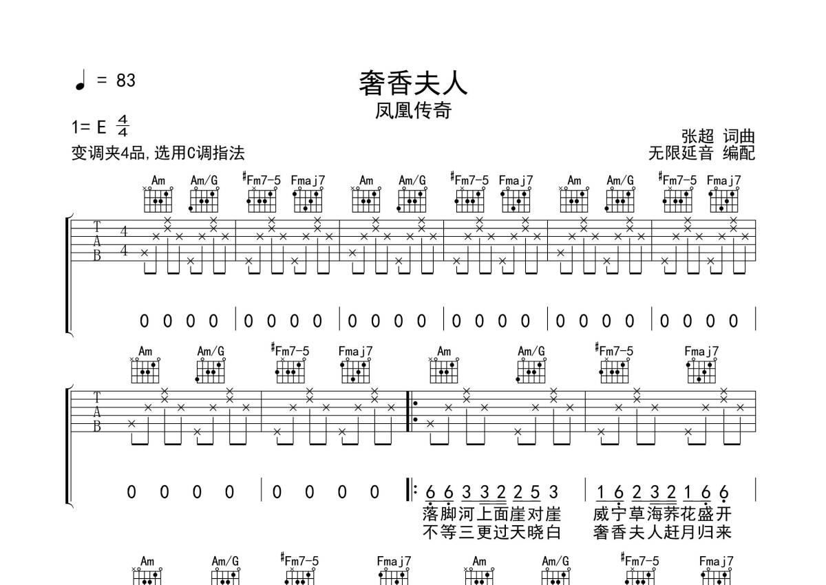 《奢香夫人》是凤凰传奇演唱的一首歌曲,拍号为4/4拍,歌曲速度为每分钟83拍,歌曲原调为E调,但由于原调指法比较难,为了方便弹奏,本吉他谱采用的是C调指法编配,变调夹4品弹奏即为原调,当然也可以根据自己的音域改变变调夹位置,或者通过改变和弦调性,以方便自己弹奏,这份吉他谱共有四张高清图谱,图谱由 @无限延音 编配上传,图谱使用六线谱编配,包含吉他和弦指法、简谱以及歌词部分,使用这份奢香夫人吉他谱,可以让你更加方便地掌握这首歌曲的弹唱技巧,快来尝试吧。