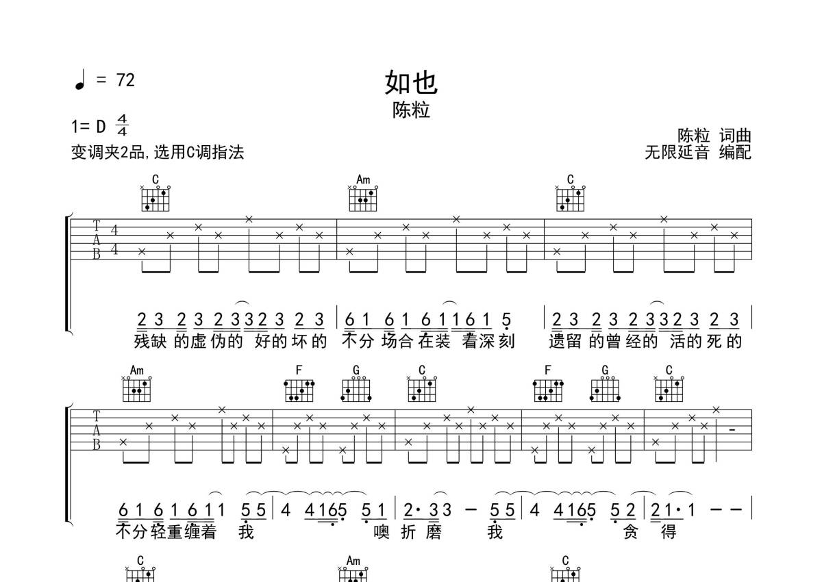 《如也》是陈粒演唱的一首歌曲,拍号为4/4拍,歌曲速度为每分钟72拍,歌曲原调为D调,但由于原调指法比较难,为了方便弹奏,本吉他谱采用的是C调指法编配,变调夹2品弹奏即为原调,当然也可以根据自己的音域改变变调夹位置,或者通过改变和弦调性,以方便自己弹奏,这份吉他谱共有三张高清图谱,图谱由 @无限延音 编配上传,图谱使用六线谱编配,包含吉他和弦指法、简谱以及歌词部分,使用这份如也吉他谱,可以让你更加方便地掌握这首歌曲的弹唱技巧,快来尝试吧。
