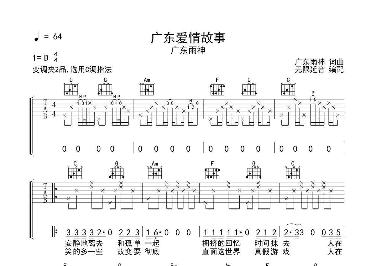《广东爱情故事》是广东雨神演唱的一首歌曲,拍号为4/4拍,歌曲速度为每分钟64拍,歌曲原调为D调,但由于原调指法比较难,为了方便弹奏,本吉他谱采用的是C调指法编配,变调夹2品弹奏即为原调,当然也可以根据自己的音域改变变调夹位置,或者通过改变和弦调性,以方便自己弹奏,这份吉他谱共有三张高清图谱,图谱由 @无限延音 编配上传,图谱使用六线谱编配,包含吉他和弦指法、简谱以及歌词部分,使用这份广东爱情故事吉他谱,可以让你更加方便地掌握这首歌曲的弹唱技巧,快来尝试吧。