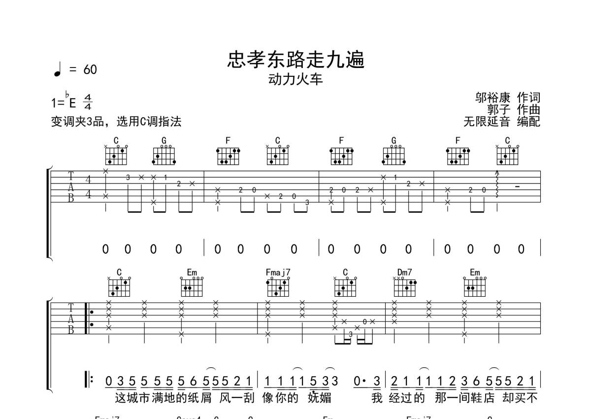 《忠孝东路走九遍》是动力火车演唱的一首歌曲,拍号为4/4拍,歌曲速度为每分钟60拍,歌曲原调为Eb调,但由于原调指法比较难,为了方便弹奏,本吉他谱采用的是C调指法编配,变调夹3品弹奏即为原调,当然也可以根据自己的音域改变变调夹位置,或者通过改变和弦调性,以方便自己弹奏,这份吉他谱共有三张高清图谱,图谱由 @无限延音 编配上传,图谱使用六线谱编配,包含吉他和弦指法、简谱以及歌词部分,使用这份忠孝东路走九遍吉他谱,可以让你更加方便地掌握这首歌曲的弹唱技巧,快来尝试吧。