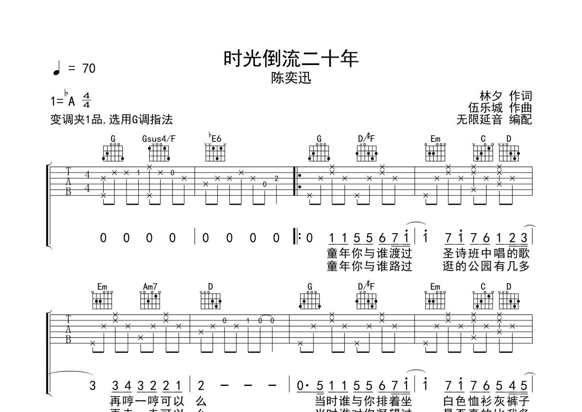 陈奕迅《时光倒流二十年》吉他谱 - G调弹唱六线谱