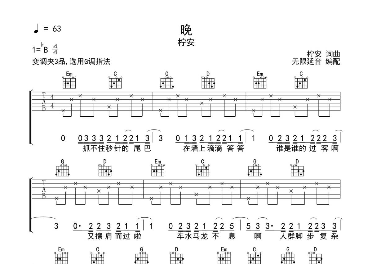 《晚》是柠安演唱的一首歌曲,拍号为4/4拍,歌曲速度为每分钟63拍,歌曲原调为Bb调,但由于原调指法比较难,为了方便弹奏,本吉他谱采用的是G调指法编配,变调夹3品弹奏即为原调,当然也可以根据自己的音域改变变调夹位置,或者通过改变和弦调性,以方便自己弹奏,这份吉他谱共有三张高清图谱,图谱由 @无限延音 编配上传,图谱使用六线谱编配,包含吉他和弦指法、简谱以及歌词部分,使用这份晚吉他谱,可以让你更加方便地掌握这首歌曲的弹唱技巧,快来尝试吧。