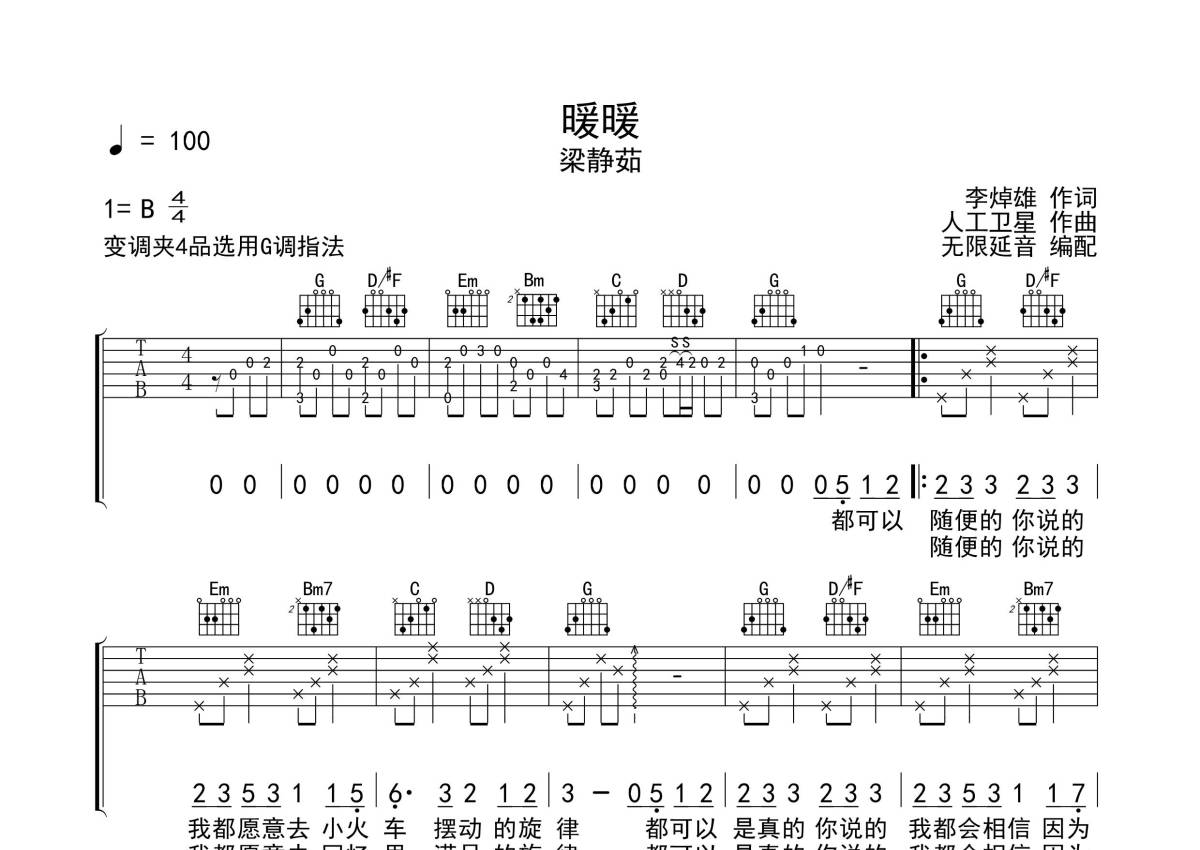 《暖暖》是梁静茹演唱的一首歌曲,拍号为4/4拍,歌曲原调为B调,但由于原调指法比较难,为了方便弹奏,本吉他谱采用的是G调指法编配,变调夹4品弹奏即为原调,当然也可以根据自己的音域改变变调夹位置,或者通过改变和弦调性,以方便自己弹奏,这份吉他谱共有两张高清图谱,图谱由 @无限延音 编配上传,图谱使用六线谱编配,包含吉他和弦指法、简谱以及歌词部分,使用这份暖暖吉他谱,可以让你更加方便地掌握这首歌曲的弹唱技巧,快来尝试吧。