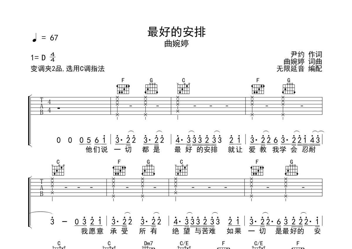 《最好的安排》是曲婉婷演唱的一首歌曲,拍号为4/4拍,歌曲原调为D调,但由于原调指法比较难,为了方便弹奏,本吉他谱采用的是C调指法编配,变调夹2品弹奏即为原调,当然也可以根据自己的音域改变变调夹位置,或者通过改变和弦调性,以方便自己弹奏,这份吉他谱共有四张高清图谱,图谱由 @无限延音 编配上传,图谱使用六线谱编配,包含吉他和弦指法、简谱以及歌词部分,使用这份最好的安排吉他谱,可以让你更加方便地掌握这首歌曲的弹唱技巧,快来尝试吧。