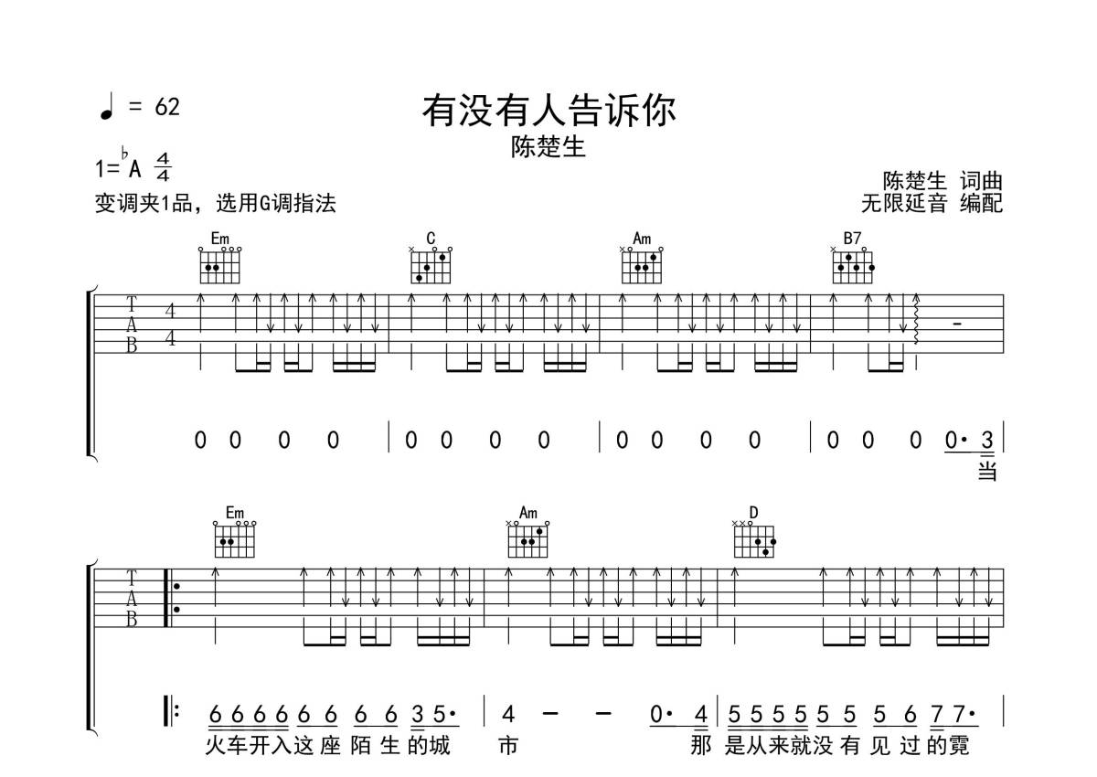 《有没有人告诉你》是陈楚生演唱的一首歌曲,拍号为4/4拍,歌曲速度为每分钟62拍,歌曲原调为Ab调,但由于原调指法比较难,为了方便弹奏,本吉他谱采用的是G调指法编配,变调夹1品弹奏即为原调,当然也可以根据自己的音域改变变调夹位置,或者通过改变和弦调性,以方便自己弹奏,这份吉他谱共有三张高清图谱,图谱由 @无限延音 编配上传,图谱使用六线谱编配,包含吉他和弦指法、简谱以及歌词部分,使用这份有没有人告诉你吉他谱,可以让你更加方便地掌握这首歌曲的弹唱技巧,快来尝试吧。
