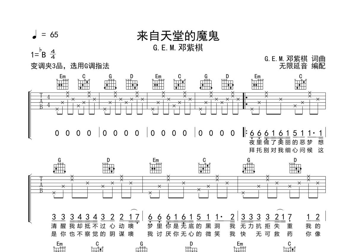 《来自天堂的魔鬼》是邓紫棋演唱的一首歌曲,拍号为4/4拍,歌曲速度为每分钟65拍,歌曲原调为Bb调,但由于原调指法比较难,为了方便弹奏,本吉他谱采用的是G调指法编配,变调夹3品弹奏即为原调,当然也可以根据自己的音域改变变调夹位置,或者通过改变和弦调性,以方便自己弹奏,这份吉他谱共有三张高清图谱,图谱由 @无限延音 编配上传,图谱使用六线谱编配,包含吉他和弦指法、简谱以及歌词部分,使用这份来自天堂的魔鬼吉他谱,可以让你更加方便地掌握这首歌曲的弹唱技巧,快来尝试吧。