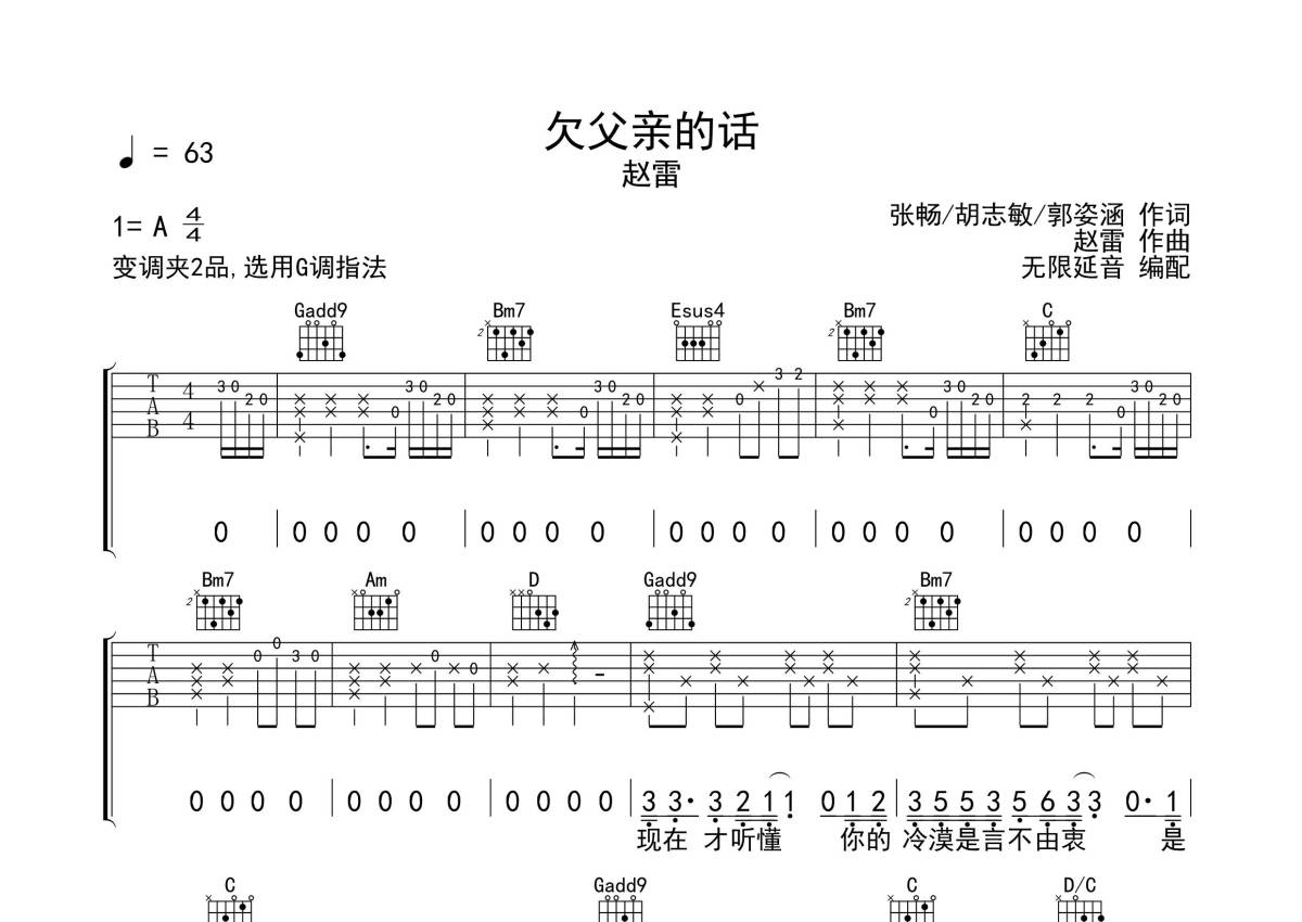 《欠父亲的话》是赵雷演唱的一首歌曲,拍号为4/4拍,歌曲速度为每分钟63拍,歌曲原调为A调,但由于原调指法比较难,为了方便弹奏,本吉他谱采用的是G调指法编配,变调夹2品弹奏即为原调,当然也可以根据自己的音域改变变调夹位置,或者通过改变和弦调性,以方便自己弹奏,这份吉他谱共有三张高清图谱,图谱由 @无限延音 编配上传,图谱使用六线谱编配,包含吉他和弦指法、简谱以及歌词部分,使用这份欠父亲的话吉他谱,可以让你更加方便地掌握这首歌曲的弹唱技巧,快来尝试吧。