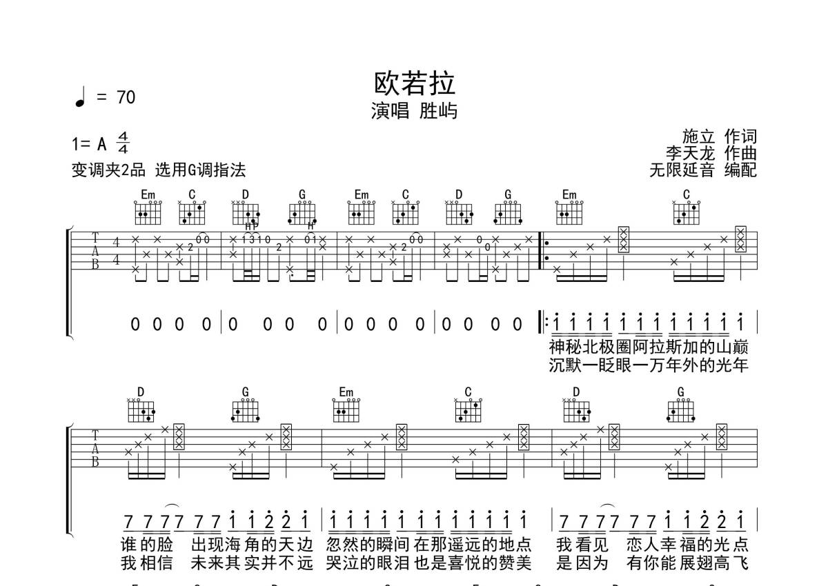 胜屿《欧若拉》吉他谱 - G调弹唱六线谱