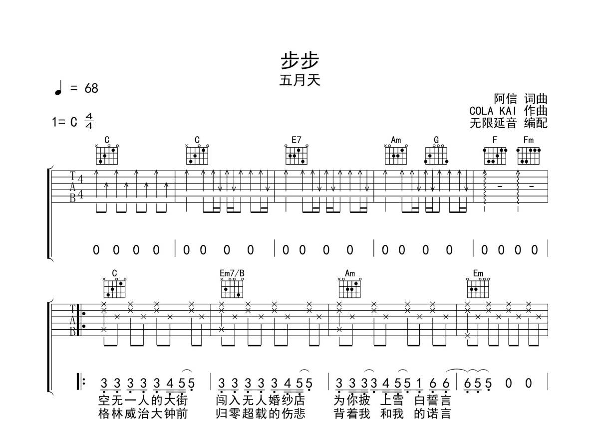 五月天《步步》吉他谱 - C调弹唱六线谱
