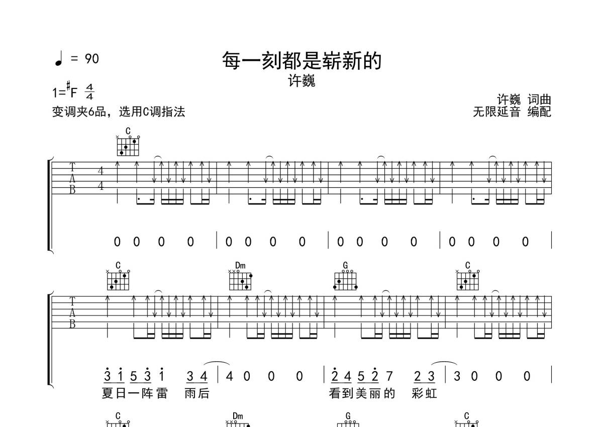 《每一刻都是崭新的》是许巍演唱的一首歌曲,拍号为4/4拍,歌曲速度为每分钟90拍,歌曲原调为Gb调,但由于原调指法比较难,为了方便弹奏,本吉他谱采用的是C调指法编配,变调夹6品弹奏即为原调,当然也可以根据自己的音域改变变调夹位置,或者通过改变和弦调性,以方便自己弹奏,这份吉他谱共有三张高清图谱,图谱由 @无限延音 编配上传,图谱使用六线谱编配,包含吉他和弦指法、简谱以及歌词部分,使用这份每一刻都是崭新的吉他谱,可以让你更加方便地掌握这首歌曲的弹唱技巧,快来尝试吧。