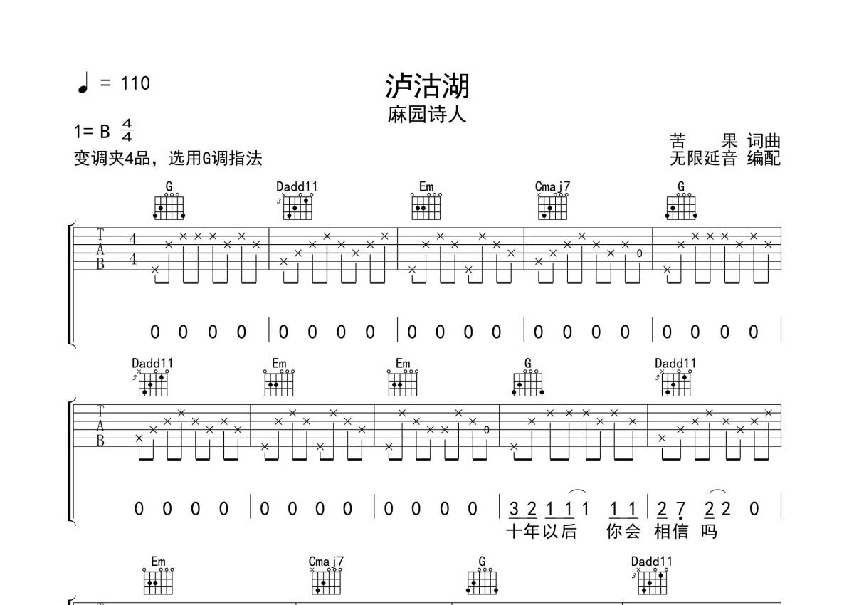 麻园诗人《泸沽湖》吉他谱 - G调弹唱六线谱