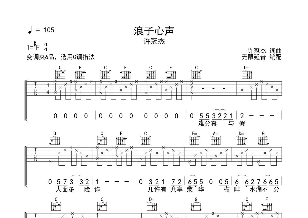 《浪子心声》是许冠杰演唱的一首歌曲,拍号为4/4拍,歌曲速度为每分钟105拍,歌曲原调为Gb调,但由于原调指法比较难,为了方便弹奏,本吉他谱采用的是C调指法编配,变调夹6品弹奏即为原调,当然也可以根据自己的音域改变变调夹位置,或者通过改变和弦调性,以方便自己弹奏,这份吉他谱共有两张高清图谱,图谱由 @无限延音 编配上传,图谱使用六线谱编配,包含吉他和弦指法、简谱以及歌词部分,使用这份浪子心声吉他谱,可以让你更加方便地掌握这首歌曲的弹唱技巧,快来尝试吧。
